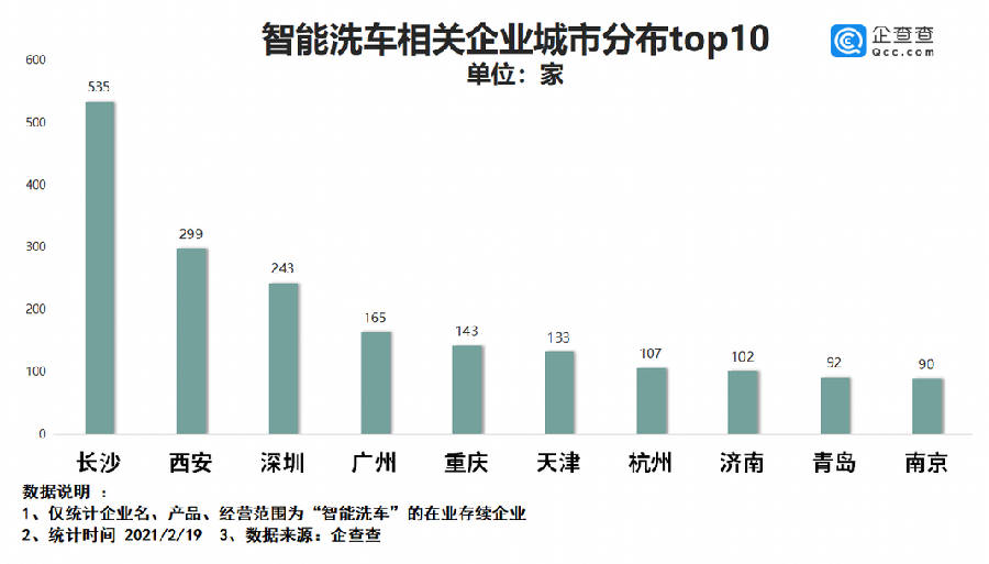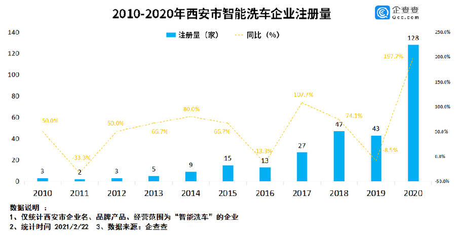 西安新闻网讯 近年来,我国汽车普及率不断升高,衍生了高效便捷的智能洗车服务。目前智能无人洗车已达到千亿级市场规模,赛道上的玩家如雨后春笋般纷纷崭露头角。2月22日,企查查发布多个方面数据显示,中国共有5100余家智能洗车相关企业,2020年新注册企业1995家,同比上涨了122.7%。其中,长沙、西安、深圳拥有量位居全国城市前三。