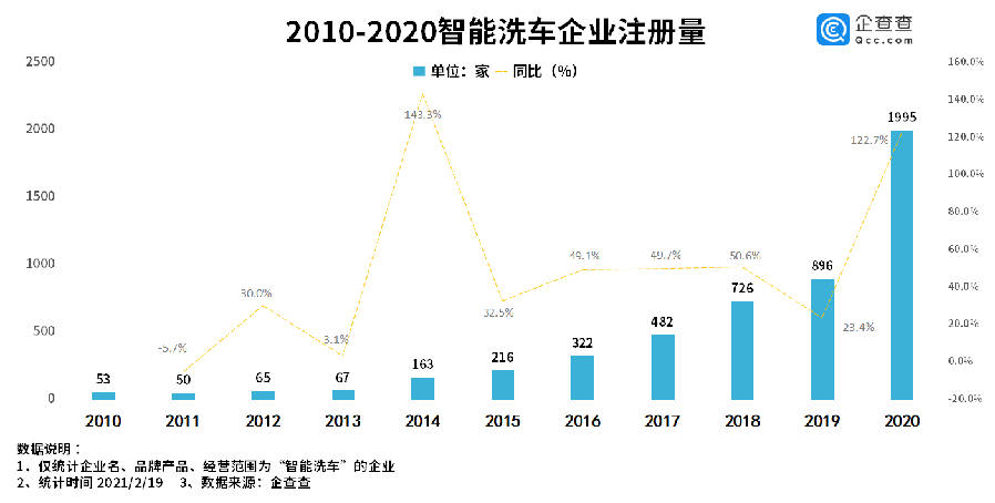 2020年,突如其来的疫情推动了无人智能洗车的普及,这一模式非常适应当下的消费需求。多个方面数据显示,近十年来我国智能洗车公司数一直增长,2014年注册量为163家,同比增长了143.3%。此后几年注册量持续增长,2018年新注册726家,同比增长50.6%。2019年注册量为896家,同比增长了23.4%。2020年注册量出现大幅上涨趋势,全年共注册了1995家,同比增长了122.7%,是过去十年中注册量最多的一年。
